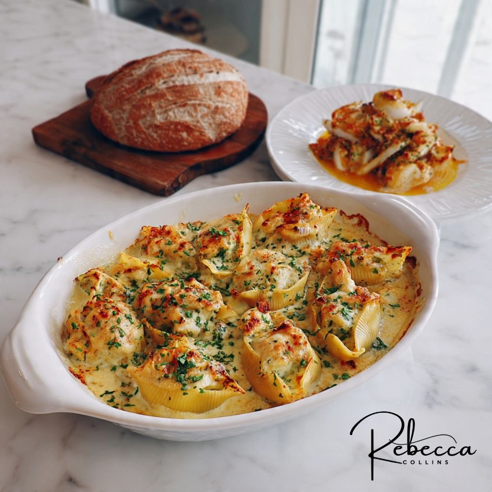 Jumbo pasta shells filled with a luxurious blend of crab, shrimp, and creamy ricotta, baked in a rich Alfredo sauce until golden and bubbly. An impressive yet approachable seafood pasta bake perfect for special occasions or a cozy dinner.