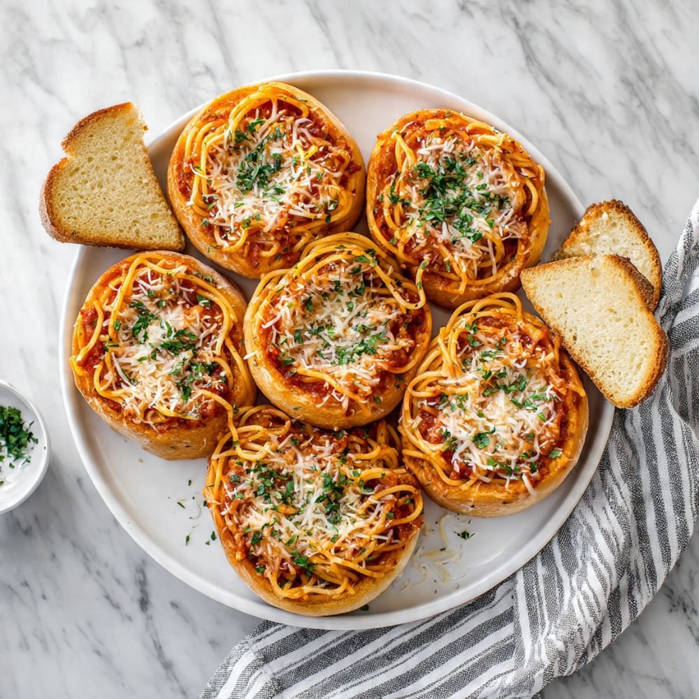 A fun and delicious twist on classic spaghetti! Tender spaghetti with rich marinara sauce served in crispy, buttery garlic bread bowls. This creative dish combines two favorites into one impressive meal that’s perfect for family dinners or entertaining.