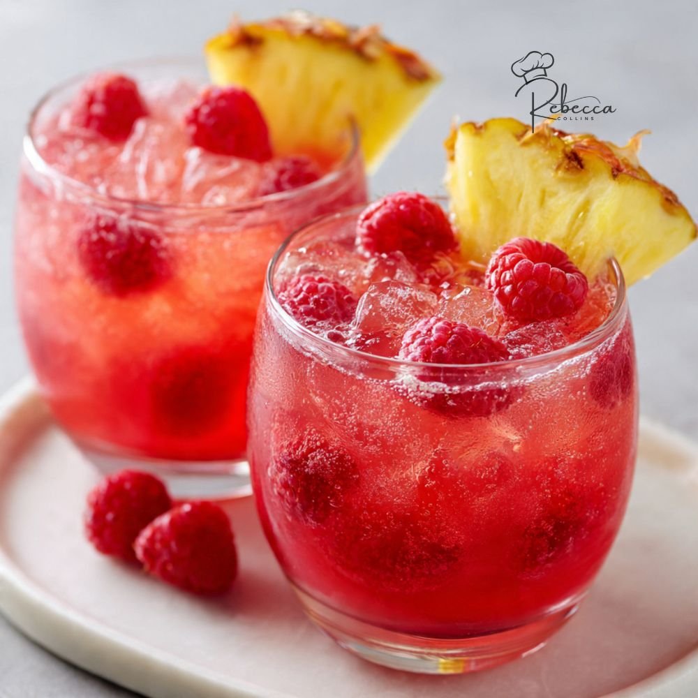 - Garnish: Garnish each glass with a pineapple wedge, a few fresh raspberries, and a cocktail umbrella.